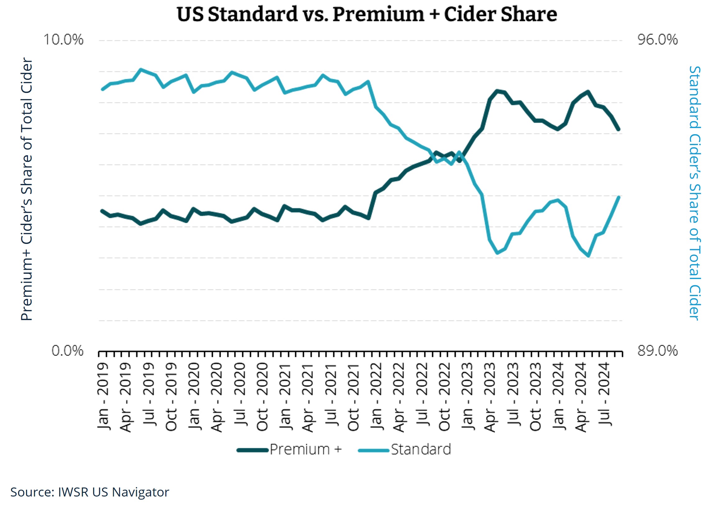 While the Standard price tier continues to dominate US cider volumes, accounting for 92% of sales in 2023 (full year) and 2024 (Jan to Sept), the Premium and Premium+ segments are steadily gaining ground. Since 2022, these higher price tiers have increased their share of the category, particularly in states with a strong cider tradition. Massachusetts (15%), Oregon (12%), and New York (12%) are leaders in Premium+ cider penetration.