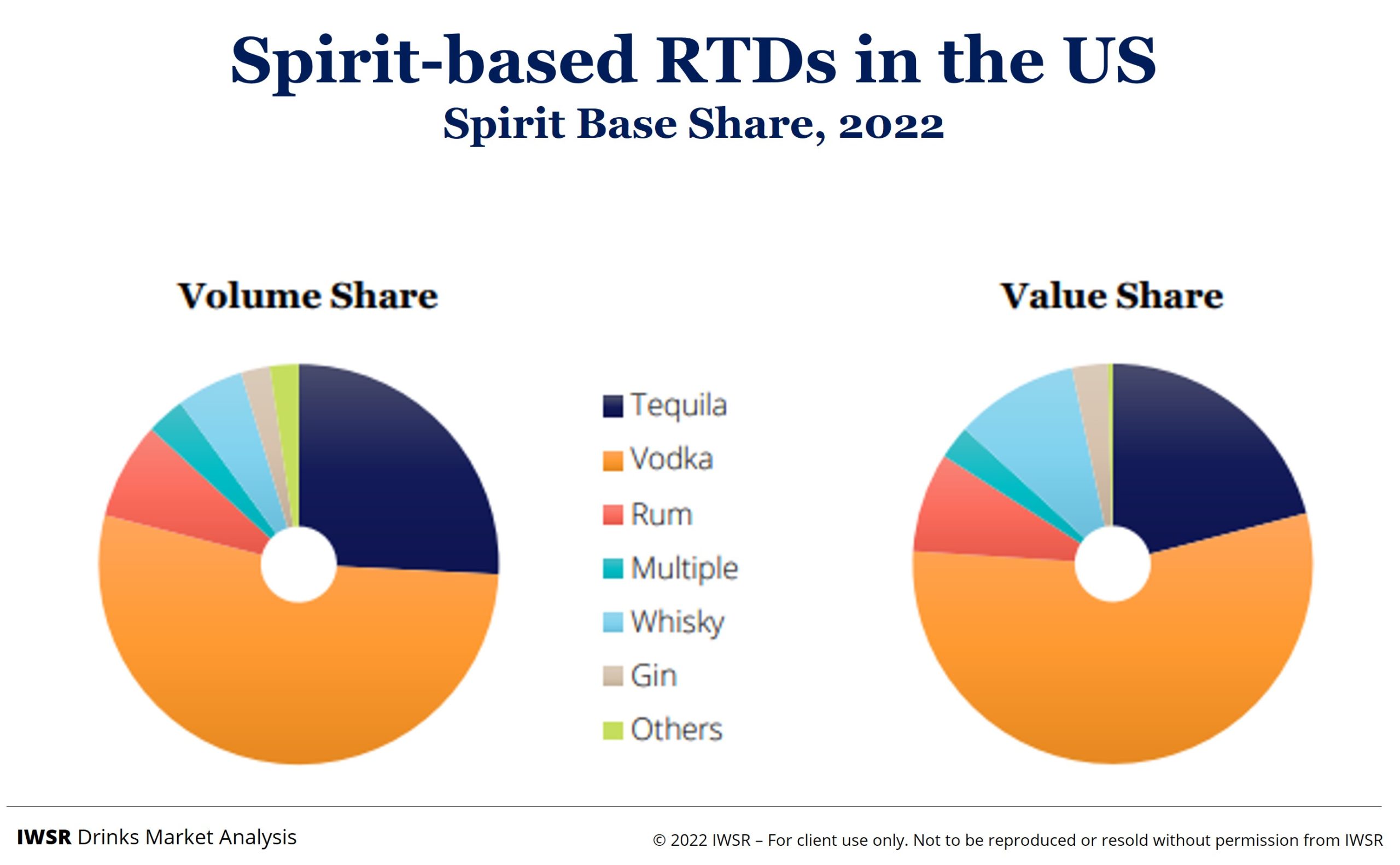Vodka-based RTDs overtook tequila as the leading RTD spirit base in 2021 in volume terms, however, new-to-market Margaritas and Ranch Waters will help to maintain tequila’s relevance in the spirit-based RTD landscape. The long drink continues to propel gin-based RTDs upwards, while new innovations from leading brands in Piña Colada, Mai Tai, and Tropical Punch are boosting rum-based drinks.