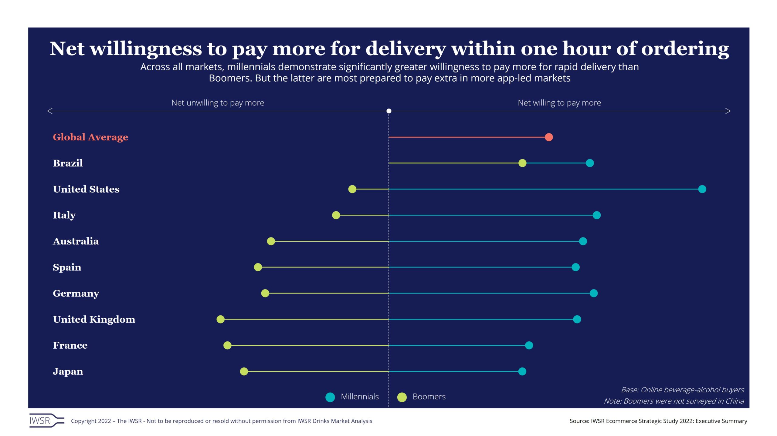 Speed is particularly important for younger consumers, including millennials and Gen Z consumers (of legal drinking age). “Millennials in all markets are strongly willing to pay more for fast delivery. Boomers, on the other hand, are currently unwilling in general,” says Wolfe.