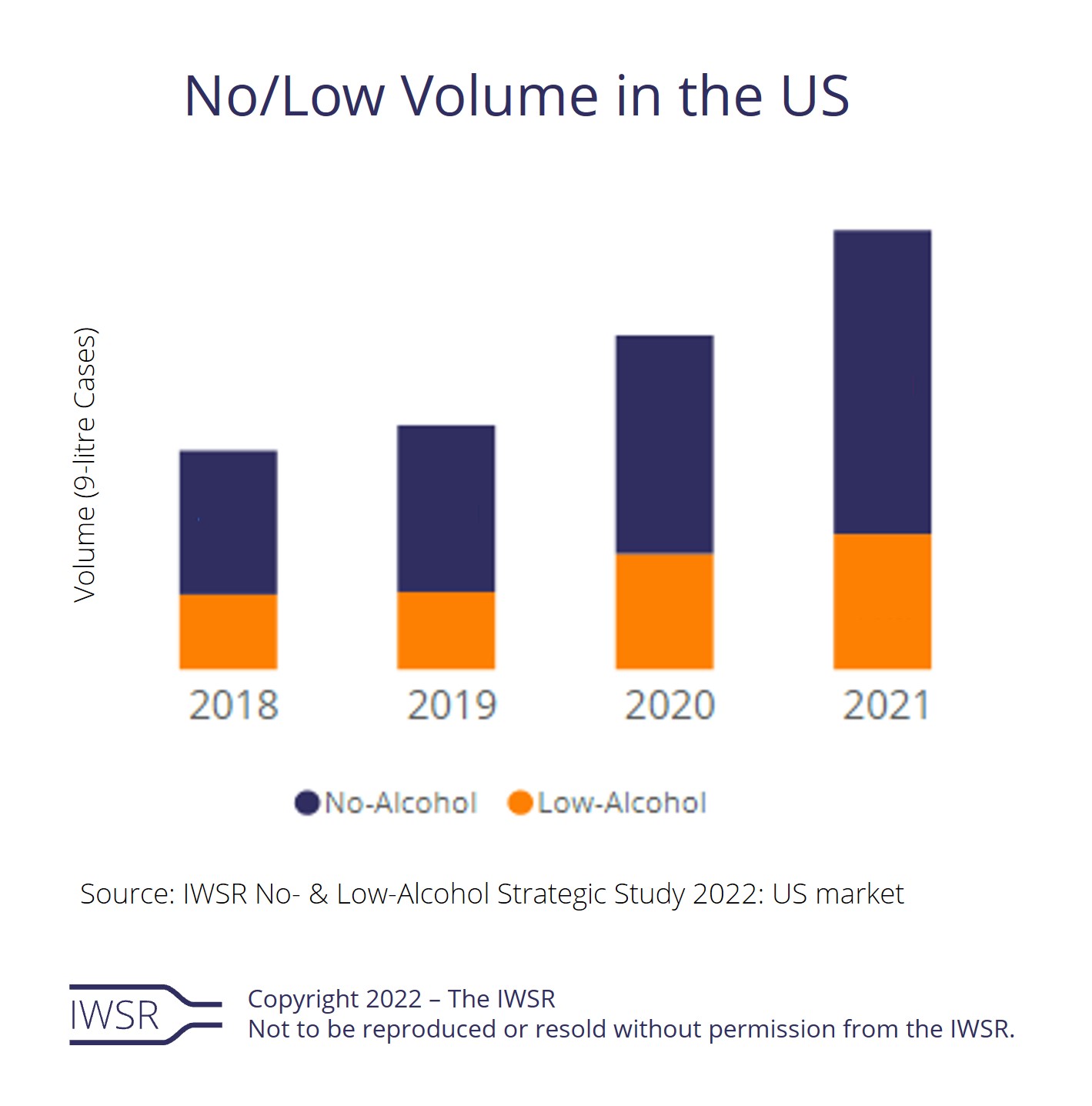 The total no/low alcohol segment in the US is currently valued at approximately $2.2bn, with volumes expected to continue to grow. While each no/low category in the US (across beer/cider, wine, spirits, RTDs, and alcohol adjacencies) has a different level of market maturity, no-alcohol products have, overall, commanded a greater share of the no/low segment in the US.