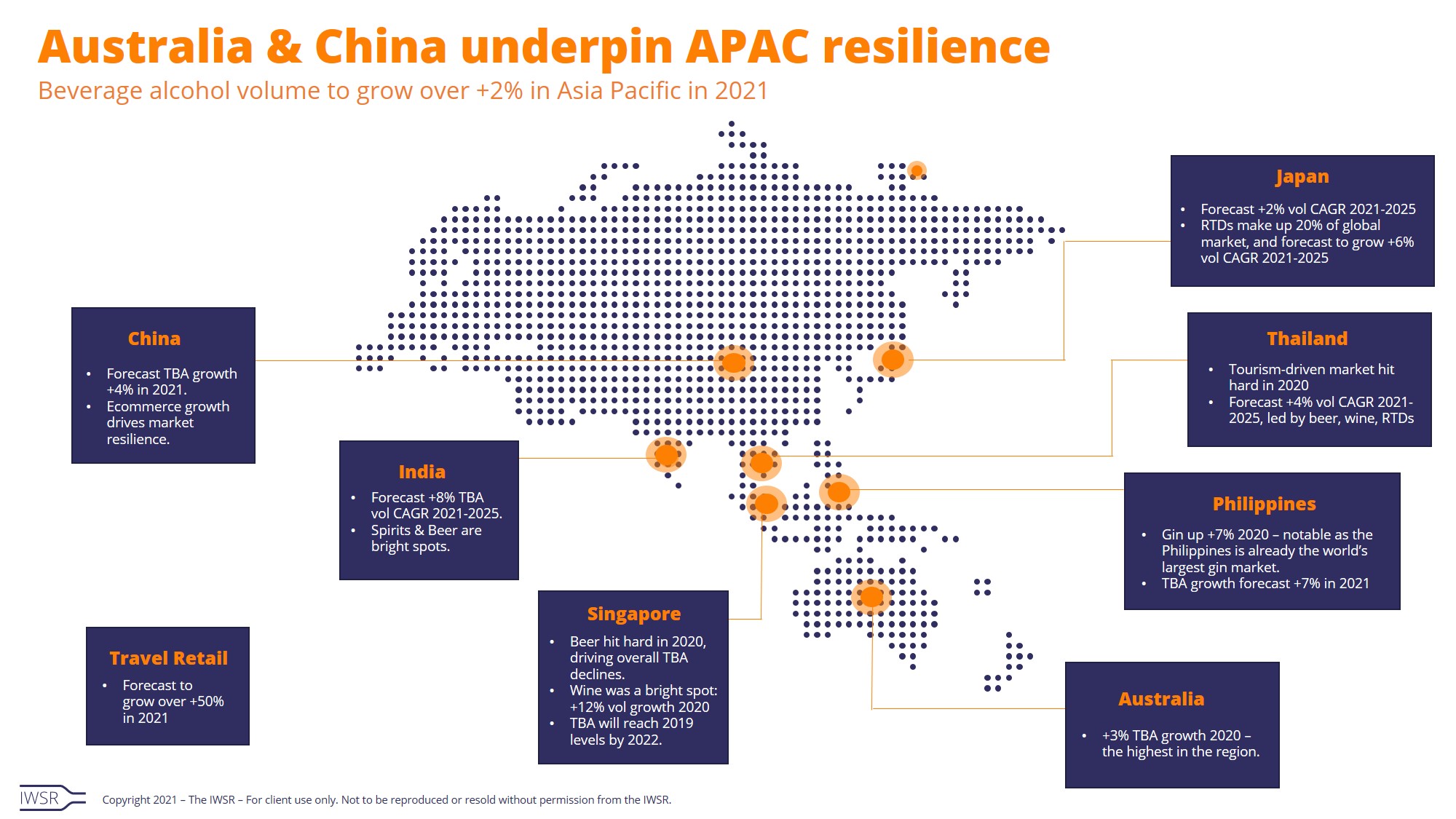 Beverage alcohol in Asia Pacific markets is showing positive signs of recovery, expected to gain over +2% in volume and over +4% in retail value by the end of 2021.