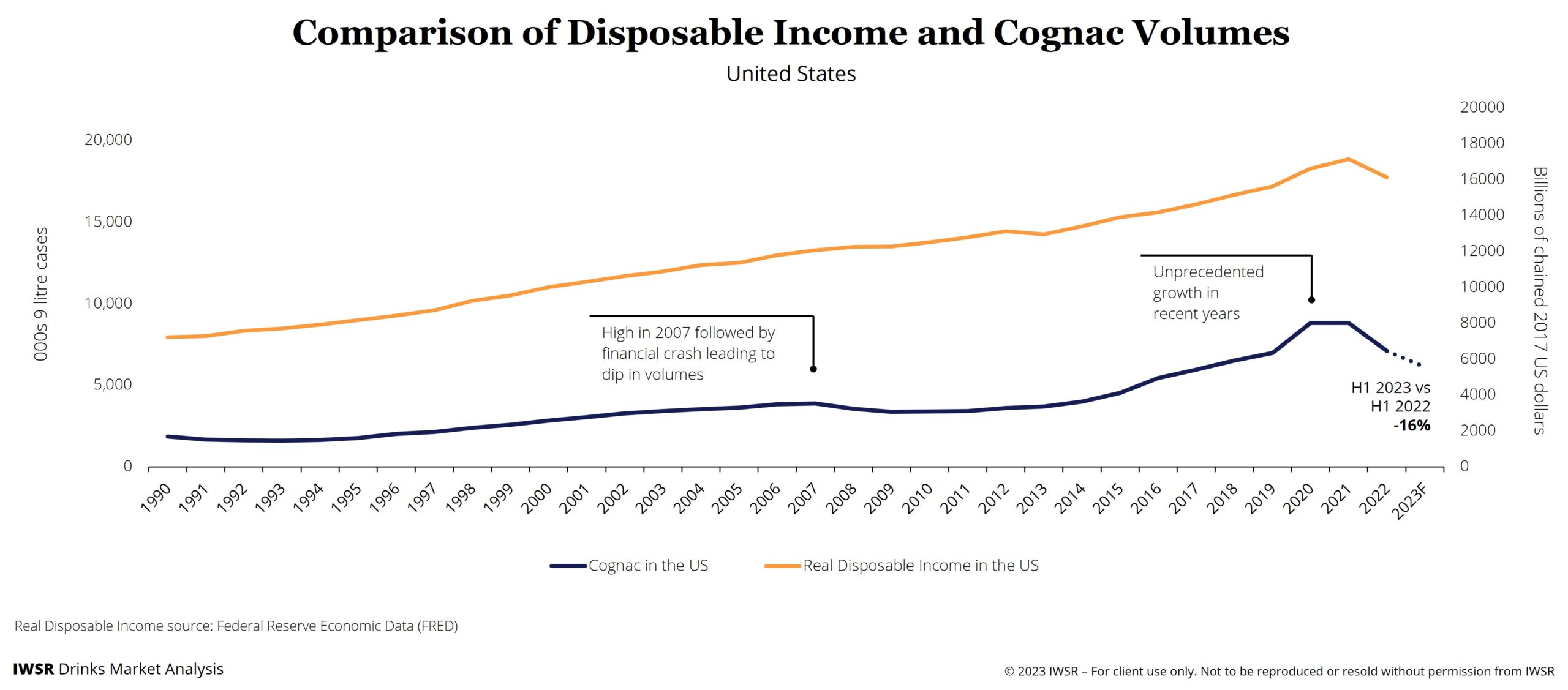 It’s important to note that Cognac’s decline is likely cyclical – not structural. The category’s current performance is driven by overexposure to economic hardship. Historical trend analysis shows a correlation between disposable income and Cognac volume consumption (see chart below).