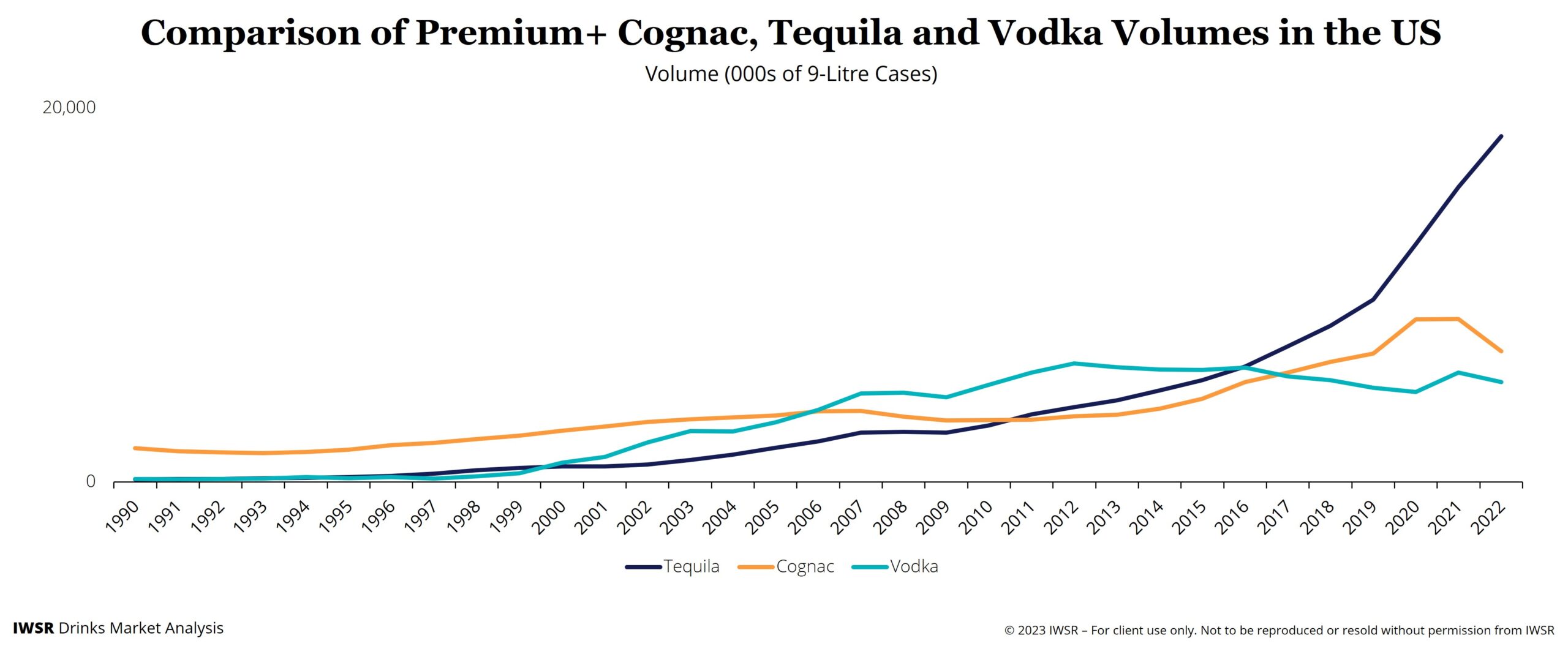 “Tequila has a number of inherent advantages over Cognac in terms of its scale, diversity and versatility,” says Jose Luis Hermoso, Research Director, IWSR. “Tequila boasts a wide variety of styles and price points versus the relatively narrow – and expensive – range of products available in Cognac.