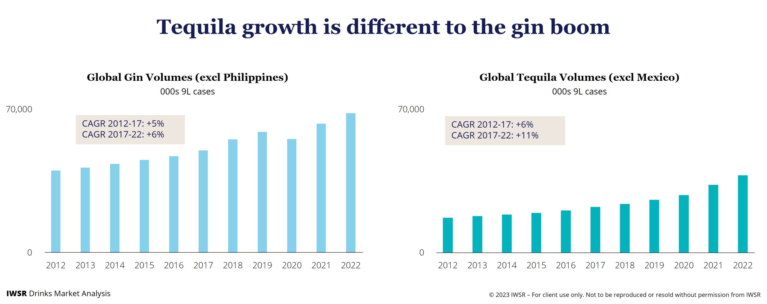Both categories have performed strongly over the past decade: global gin volumes (excluding the large, low-priced Philippines market) grew at a CAGR of +5% between 2012 and 2017, and +6% between 2017 and 2022, according to IWSR figures.