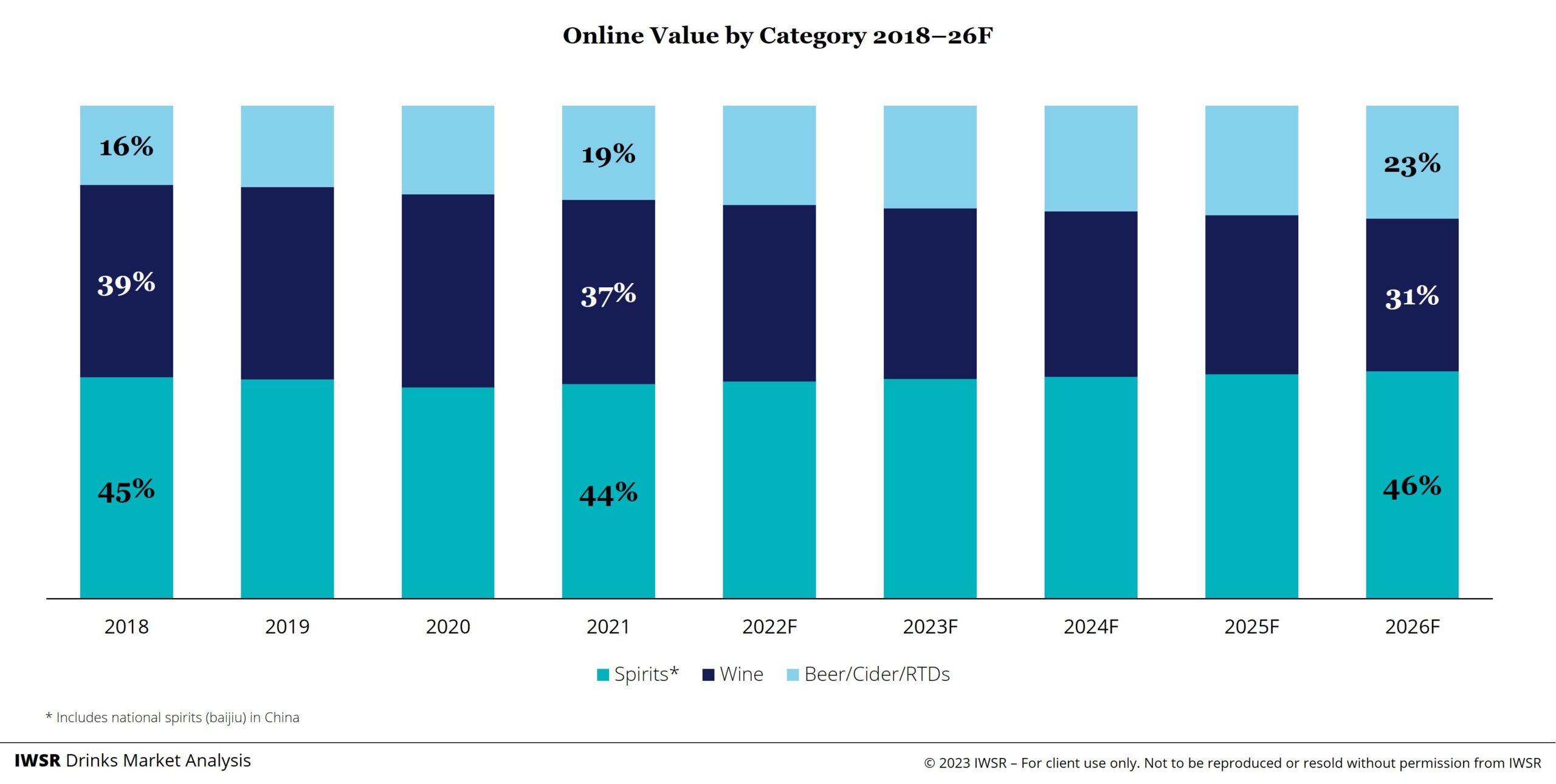 As a result, wine’s share of online sales will decline from 37% in 2021 to 31% by 2026; over the same timescale, spirits’ share will rise from 44% to 46%, while beer/cider/RTDs will increase from 19% to 23%.