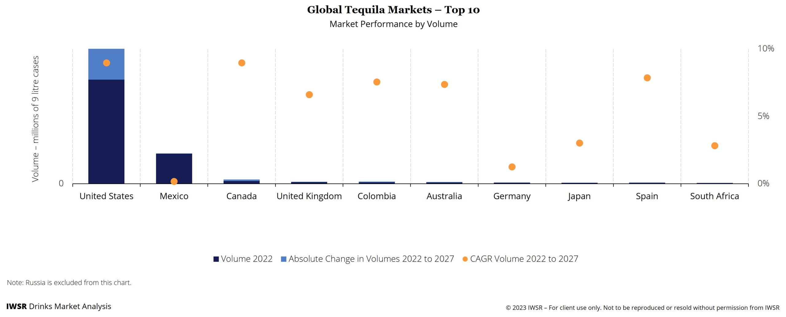 While global tequila volumes are set to rise at a compound annual growth rate (CAGR) of +7% between 2022 and 2027, the US is poised to grow at a CAGR of +9% over the same period.