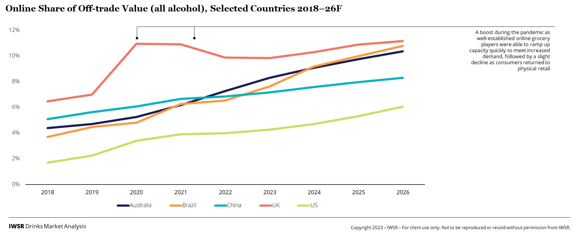 Like many other consumer goods, wine saw a spike in ecommerce during the pandemic, with many consumers ordering online for the first time. Fears that this behaviour would fall away once the world returned to normal have proved unfounded, with participation rates post-Covid either stable or growing. In many key markets, although growth in wine ecommerce is moderating, online’s share of alcohol sales is trending upwards.