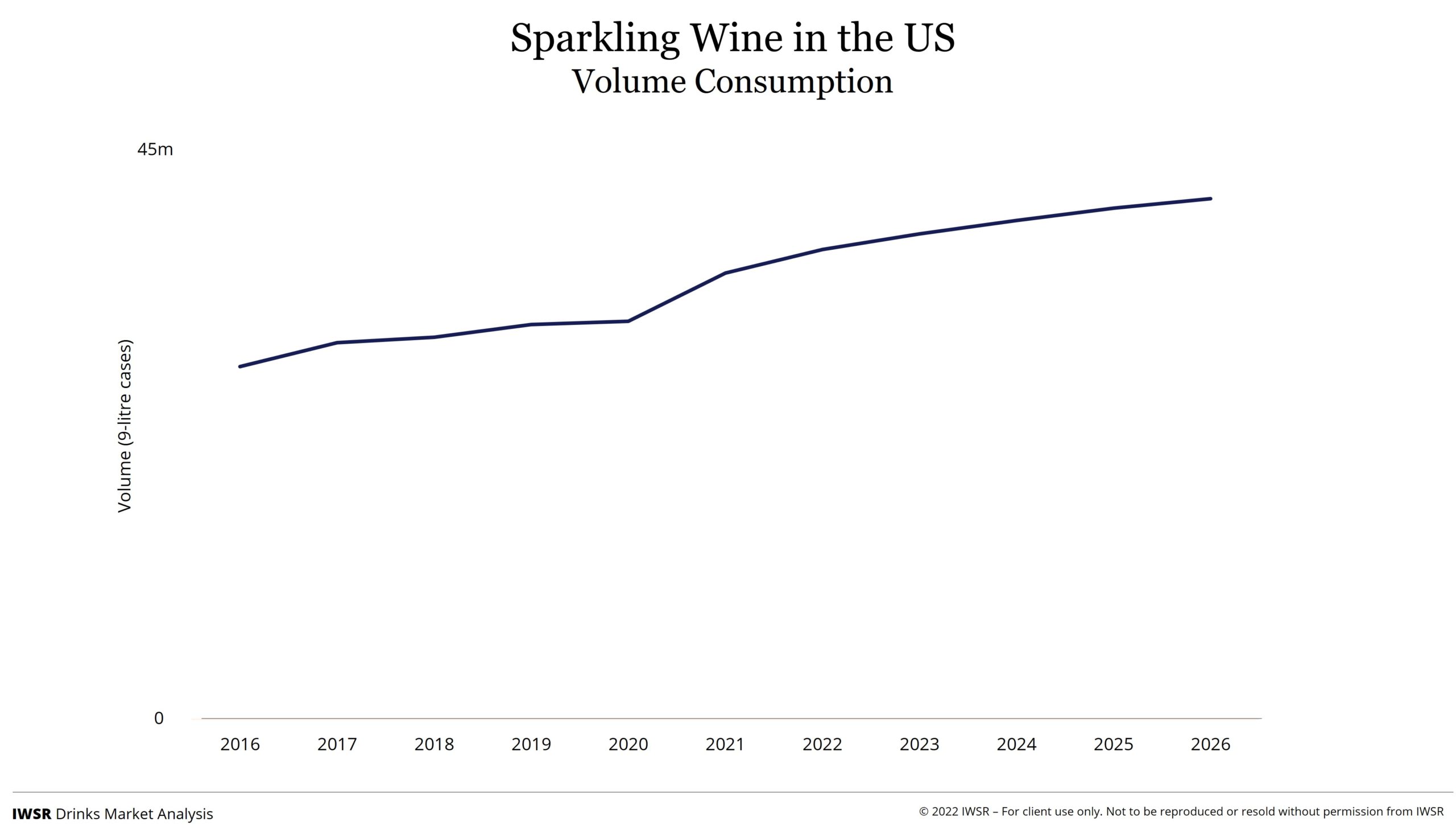 The world’s most valuable sparkling wine market and its third largest volume market, the United States, celebrated its twentieth consecutive year of growth last year. A pent-up demand to celebrate weddings, holiday gatherings and other personal milestones after the restrictions of the pandemic helped accelerate growth to double digits in 2021, and the US market for sparkling wine has now expanded by more than a quarter in just five years.