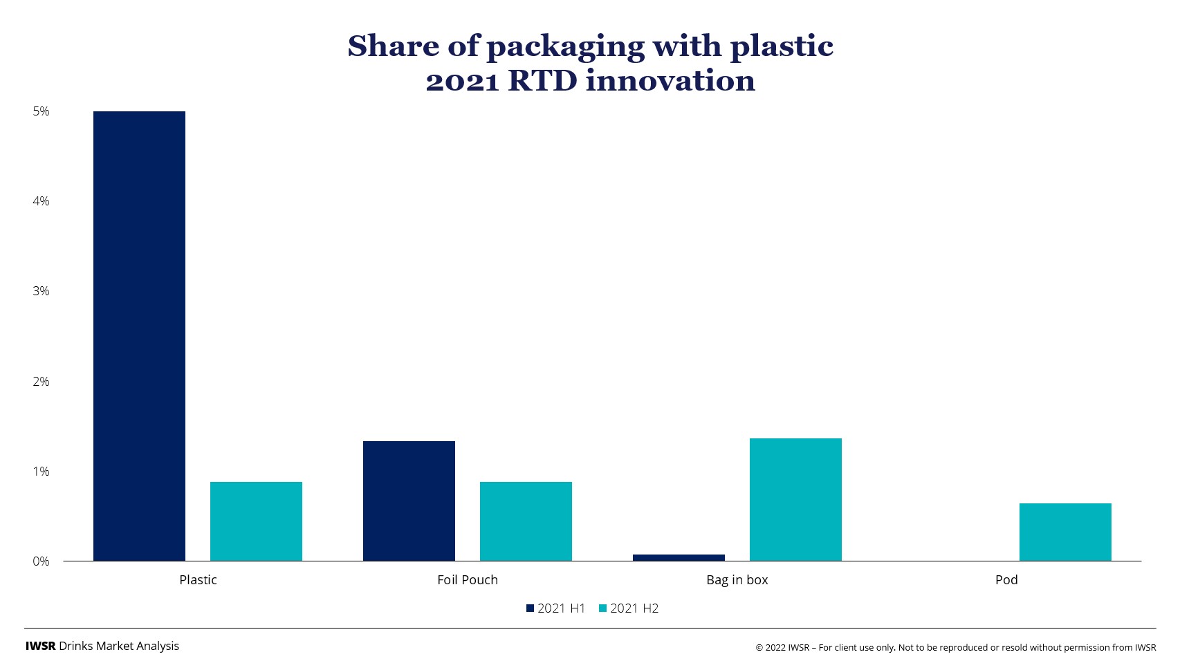 The number of RTD products using plastic-only packaging is reducing. IWSR data shows that just 1% of new RTD products used plastic-only packaging in the second half of 2021, down from 5% in the first half of the year.