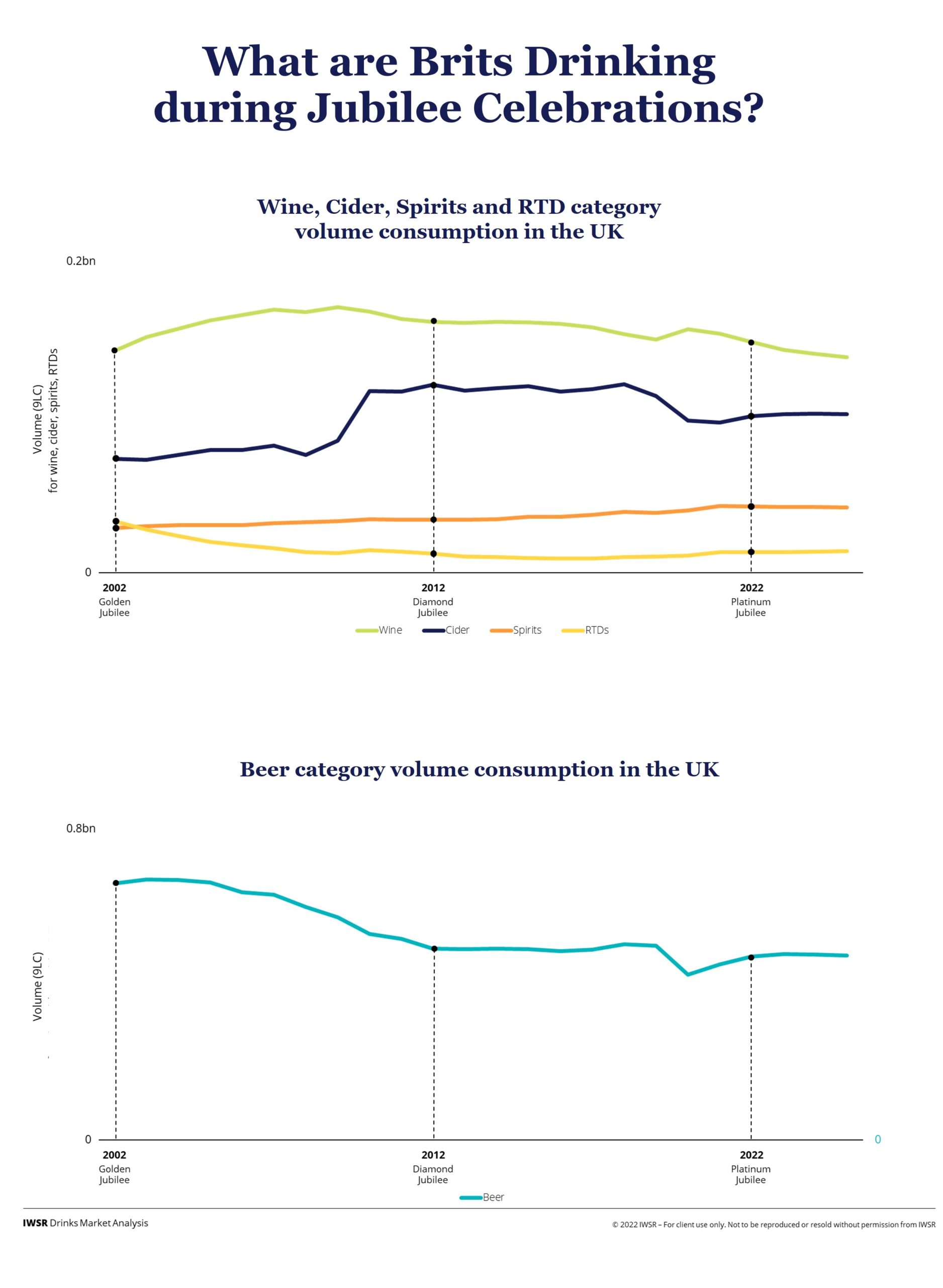 The re-emergence of cider since 2002 came at the expense of RTD products, which had decimated cider sales less than a decade earlier when they first hit the marketplace. The cycle has turned again though, and RTDs are now riding high. After RTD volumes declined by more than half between 2002 and 2012, RTD volumes in the UK have increased by 10% since the Diamond Jubilee.