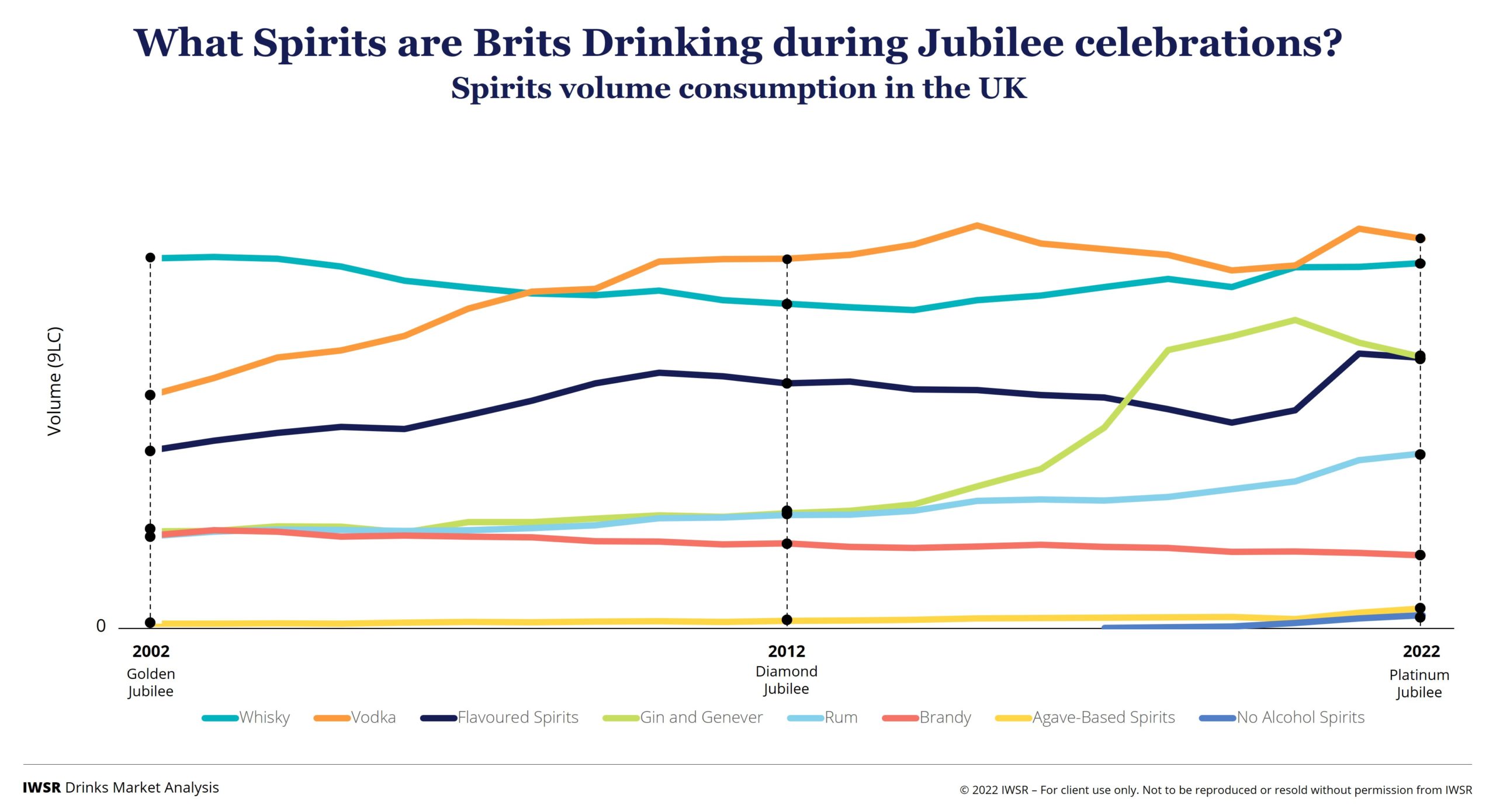 Whisky was by far the dominant spirit category during the Golden Jubilee. However, it was in long-term gradual decline, and consumers began to transition from whisky to flavoured spirits and especially vodka. While whisky commanded over 30% share of spirits consumption during the Golden Jubilee year, its share is now closer to 20%.