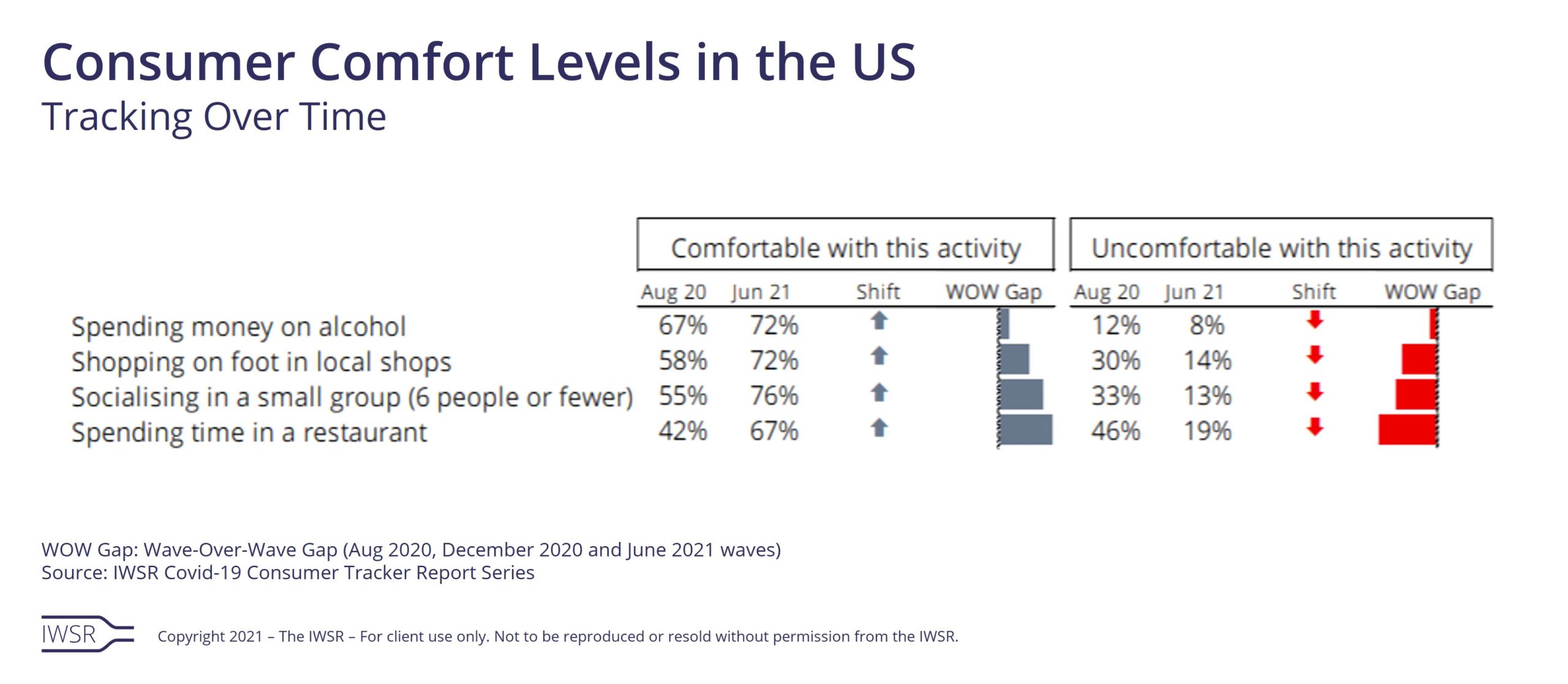 The US on-premise has been a particularly volatile environment since the start of the pandemic due to differing local government restrictions. However, more people feel increasingly confident going out to on-trade establishments this year compared to last year, with IWSR consumer data showing a net increase in likelihood of consumers visiting restaurants and bars.