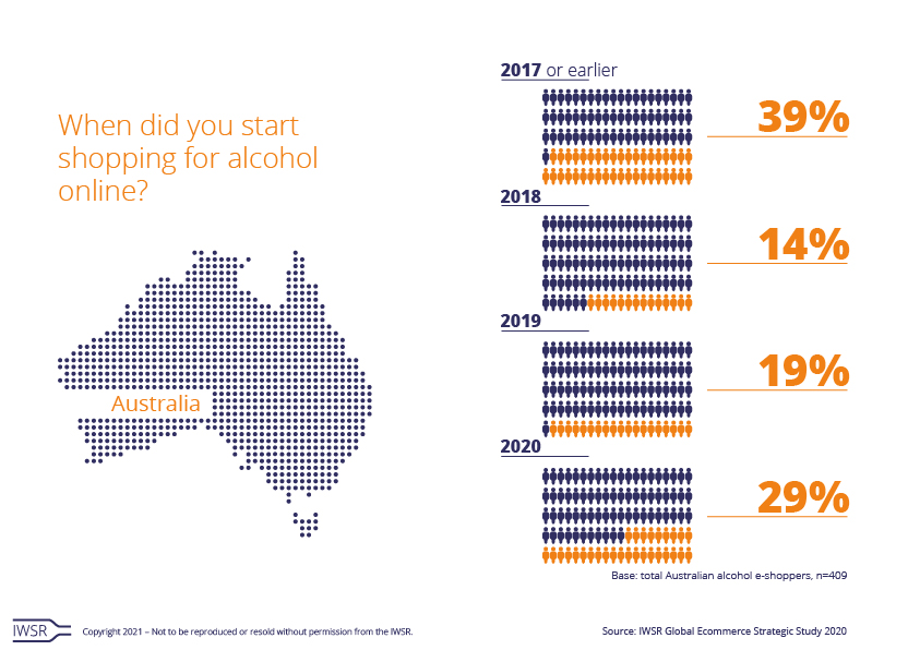 In contrast to both China and Japan, there has been a significant increase in the number of new alcohol ecommerce consumers in Australia, with 29% saying they started to buy alcohol online in 2020. Interestingly, alcohol shoppers who bought online for the first time in 2020 are likely to buy more frequently (32%) than experienced e-shoppers (17%); the latter group however tends to buy more consistently (49%).