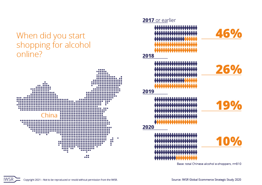 Nevertheless, the value of the online alcoholic drinks market in China is expected to see a temporary boost from the impact of Covid-19, and should then continue to grow steadily up to 2024. According to consumer research by IWSR, only 10% of Chinese alcohol shoppers started buying online in 2020, while 46% said they started in 2017 or earlier. As such, Chinese e-shoppers are generally quite experienced compared with those in other markets.