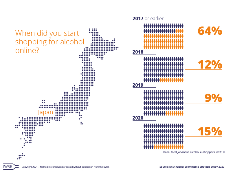 Likewise in Japan, many consumers were accustomed to buying alcohol online before the pandemic – 85% according to IWSR figures, with 64% claiming to have done so in 2017 or earlier. However, more consumers started to buy alcohol online in 2020 versus 2019 (15% versus 9%), which was not the case in China (10% versus 19%).